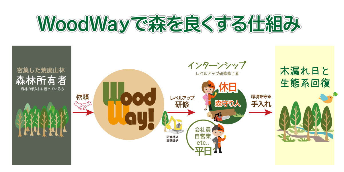 私達は環境を守る森づくりへの取り組み方として、生業は勧めていません。平日は会社員や自営業など様々な職業につき、休日のみ森へ入って手入れをする、そのような生き方を私達はWoodWayと呼んでいます。
