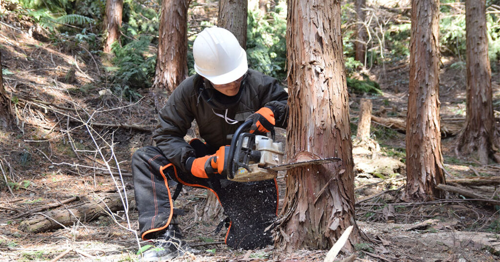 生まれてこのかたチェーンソーを一度も触ったことがない人でも、3日間みっちり研修を受けることで、装置の構造からメンテの方法、そしてなんと実際に伐倒まで実践します。