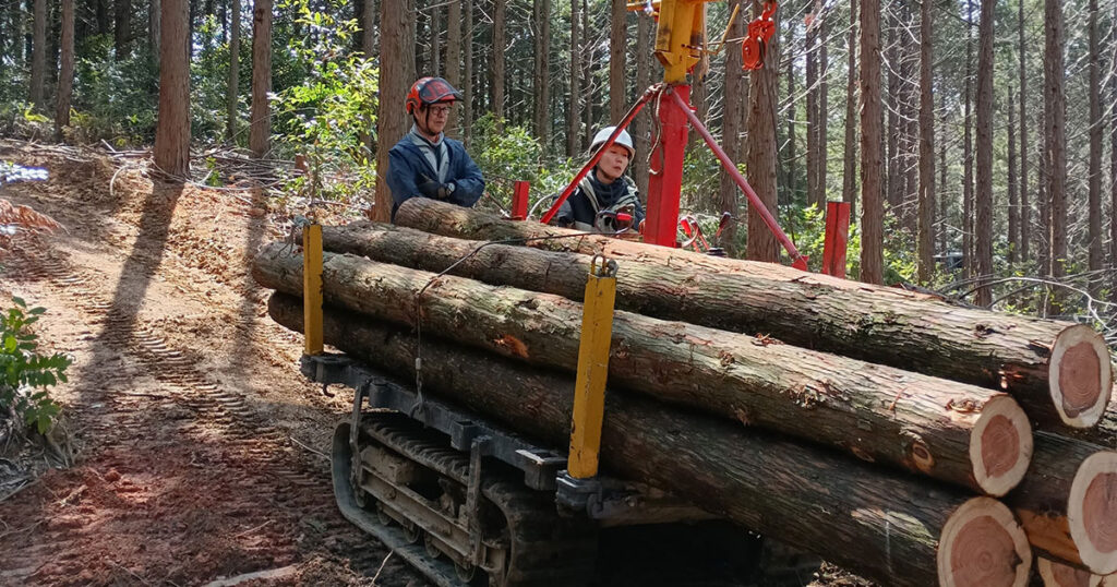 森の手入れの中で、間伐した後や、道を作った時に支障木として伐倒したスギやヒノキなどは、長さを揃えて造材し、出入り口の「土場」まで運んで出荷します。その時に活躍するのが「林内作業車」です。小さい車体に約1トンの材木を乗せて、運び出すことができます。