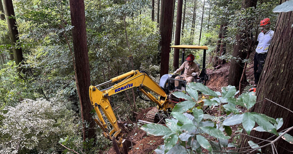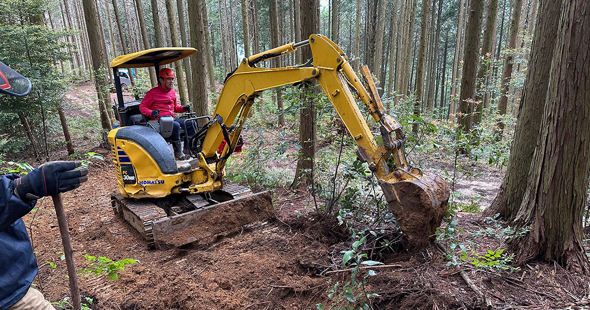 レベル2を終えて森づくりの基礎を一通り理解した後、レベル3中級では重機の操作技術のさらなるスキルアップを図ります。災害に強く壊れない道づくりなど、森林での様々な経験を積んで応用練習を行います。
